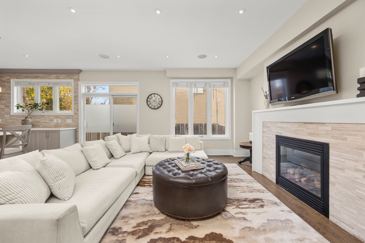 Disfruta de esta casa adosada privada, moderna, acogedora, inteligente e integrada de 2 dormitorios con capacidad para 7 personas en el norte de Toronto. Hermosa cocina equipada, comedor y sala de estar. Más de 2 plazas de aparcamiento gratuitas y seguras. Se puede ir andando al metro, tiendas, restaurantes, parques y servicios 24/7. Tu estancia incluye un balcón/barbacoa, zona familiar con sofá reclinable y TV inteligente de 70 pulgadas, internet de alta velocidad, altavoces y juegos de mesa, nivel inferior con lavandería completa, baño con ducha, dormitorio principal con baño privado, segundo dormitorio y amplio almacenamiento.