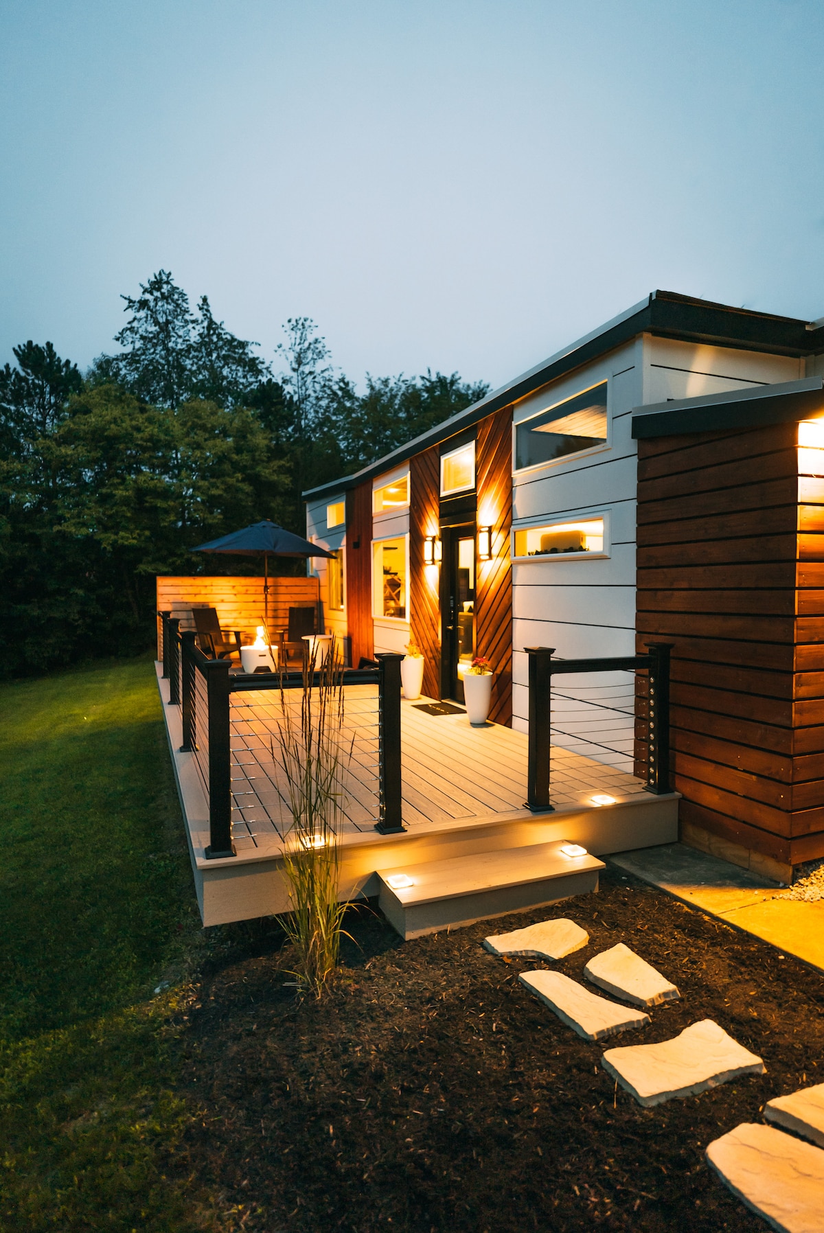 El Lux es nuestra minicasa más grande y lujosa. Con 32 pies de largo, se ve llamativa desde la distancia. El techo de mariposa y las paredes decorativas te dan una idea de lo que puedes esperar cuando entres. El Lux tiene todos los elementos básicos que esperarías de una estancia de lujo: baño completo con agua corriente (no un inodoro de compostaje), cocina completa, calefacción/aire acondicionado, wifi rápido y una cama tamaño queen de espuma viscoelástica. Pero es lo que no esperarías en una casa pequeña lo que te atrapará.