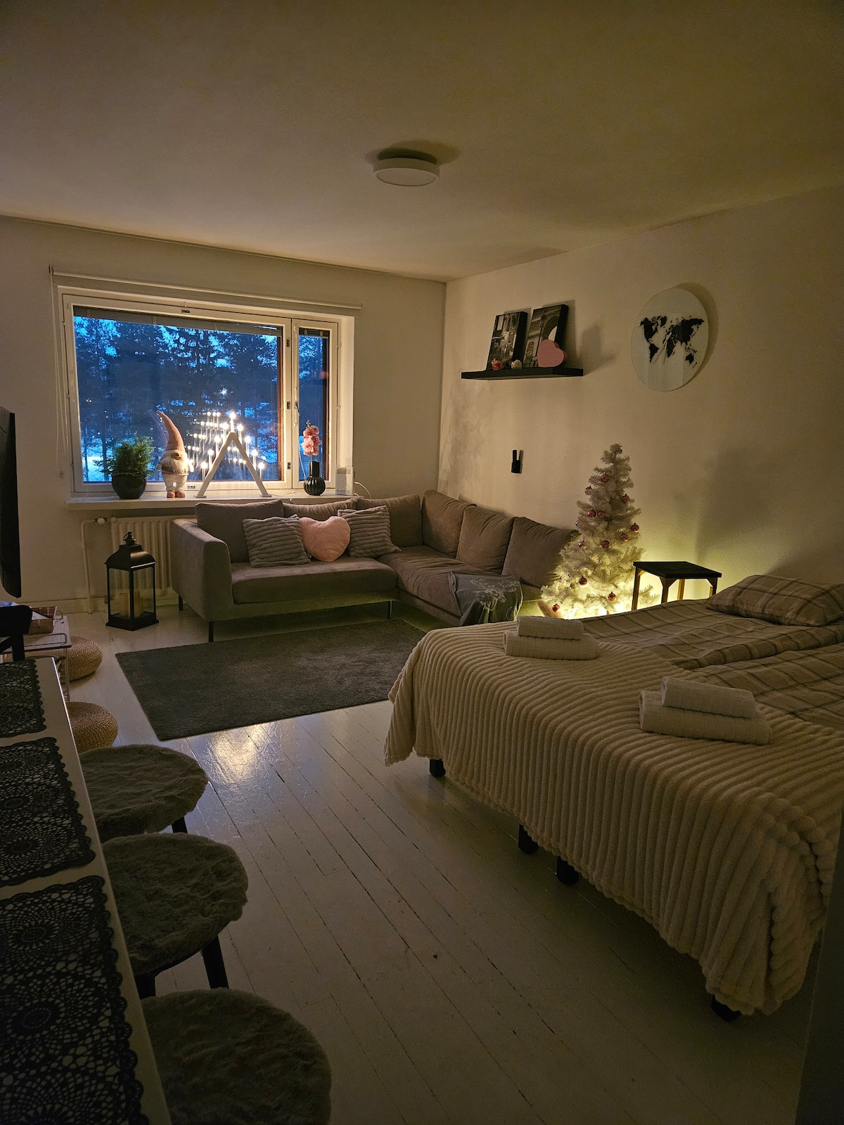 Para el invierno de la temporada 2019-2020, se renovó el acogedor condominio de Kari. Este cómodo departamento de un dormitorio está a solo cinco minutos a pie del centro de la ciudad. Sauna, balcón, cocina bien equipada. Este apartamento en la planta superior es fácilmente accesible en ascensor. El apartamento se adapta mejor a parejas, solteros y viajeros de negocios. Barrio tranquilo y seguro, un espacio de estacionamiento privado para tu auto frente al edificio. Disfrutarás de tu estadía en Rovaniemi en nuestro departamento limpio, acogedor y cómodo.