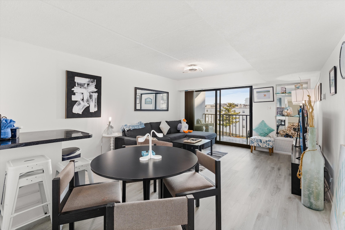 Despiértate con el sonido de las olas rompiendo fuera de tu ventana y termina tus días relajándote en el balcón privado mientras observas la luna salir sobre el océano. Ven a encontrar tu serenidad junto al mar en nuestro moderno condominio frente al mar. Ubicado en el centro de Ocean City, puedes mantener tu auto estacionado en nuestro lugar dedicado y caminar hasta muchos de los mejores restaurantes, bares y entretenimiento de la ciudad, así como el Centro de Convenciones y el Centro de Artes Escénicas. Paseos matutinos por la playa y sorbos por la noche te esperan :)