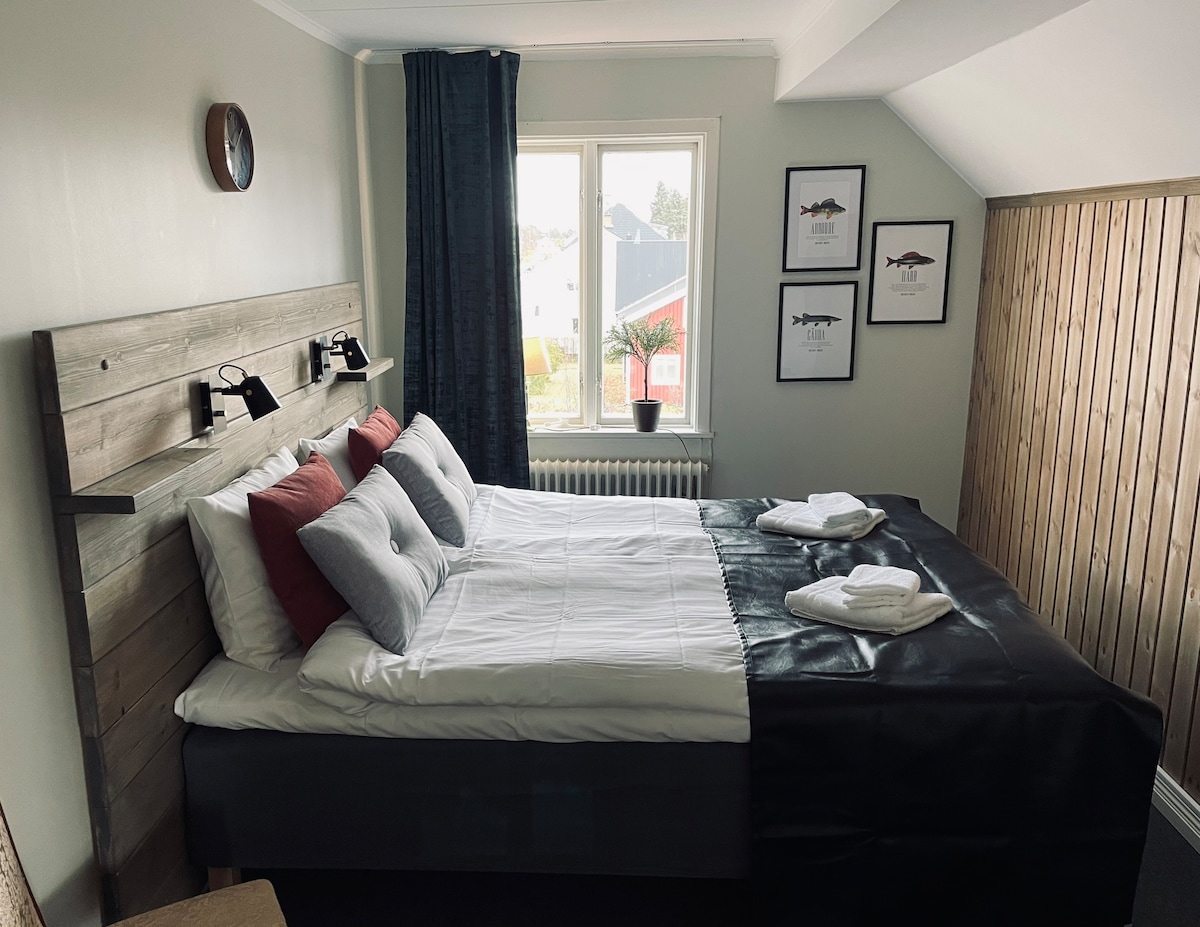 Bienvenido a nuestras habitaciones de hotel en «Sølvane Farm Hotel» ¡LEE TODA LA INFORMACIÓN SOBRE NUESTRO HOTEL ANTES DE LLEGAR! Disfruta de la naturaleza, la comida y la cultura: En esta habitación de lujo encontrarás una cama continental de 150 cm, 2 sillones, un baño con ducha efecto lluvia y un minibar. ¡La habitación tiene ventanas panorámicas y bonitas vistas! Desayuno incluido. Pregunte si la cena está disponible. Los conciertos son en el granero durante el verano. Por favor, lee sobre la granja en nuestro sitio web y redes sociales antes de la llegada: «solvanegard»