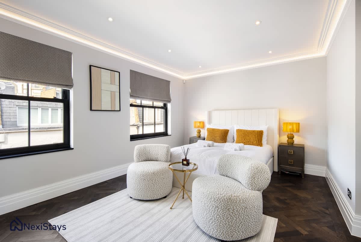 Welcome to our brand-new, luxurious three-bed townhouse, nestled in a quiet street in the heart of London's Marylebone. This elegant space brings a sense of style and sophistication to your stay with ultra-modern fittings and tasteful decor. You'll find three well-appointed en-suite bedrooms equipped with super king and king-size beds, premium Egyptian cotton bed linen, and fluffy towels. All bedrooms feature air conditioning for that cool touch on warm summer days.