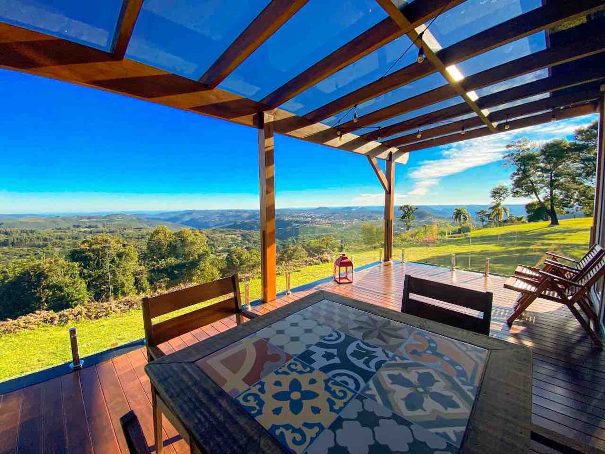 ¡Lugar increíble! Excelente lugar para descansar, desconectar de la vida urbana y conectar con la naturaleza. ¡Cerca del centro de Gramado, esta casa nos hace entrar en un mundo mágico en la granja! ¡Casa nueva, limpia, muebles de excelente gusto y la vista impresionante! ¡Romántico y muy silencioso! ¡Quien ve por las fotos no se imagina que todo es mucho más hermoso en persona! ¡Lo recomiendo mucho! (Palabras de la huésped Thaiani) Con 1 dormitorio doble, sala de estar/cocina integrada, baño, chimenea y balcón.