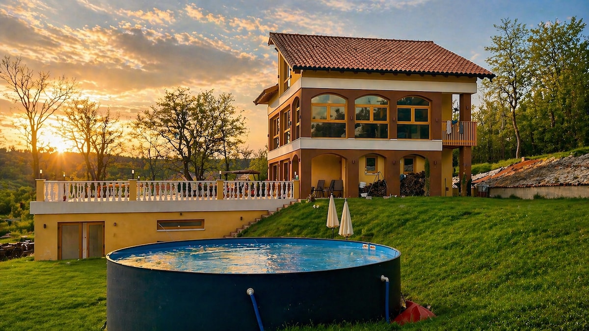 Villa Beelvita offers a heated pool from May to October and a year-round jacuzzi, creating the perfect place to relax in nature. Enjoy a rooftop jacuzzi with panoramic views of the Börzsöny mountains, a spacious terrace, and a modern kitchen. Each room has a TV for your comfort. Located just one hour from Budapest, near the thermal baths in Štúrovo and historic Esztergom. Ideal for unforgettable moments with family or friends.