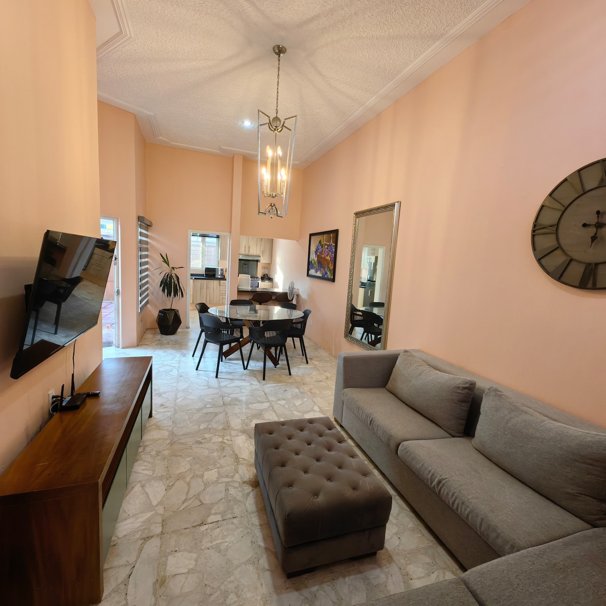Apartamento espacioso y acogedor, ideal para trabajar con excelente internet 100 Megas. Dos amplios dormitorios, ambos con aire acondicionado, baños completos, vestidor y ventilador de techo. Sala de TV donde puede dormir una quinta persona. Sala+comedor con ventana grande y 4 ventiladores portátiles para moverse por cualquier área. Cocina completamente equipada con vajilla para 6 personas. A los huéspedes anteriores les ha gustado la elegante decoración, comodidades y ubicación privilegiada.