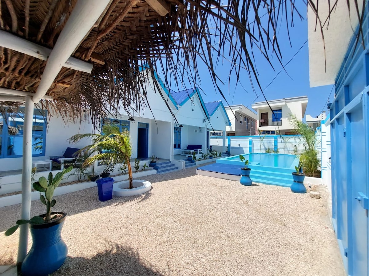 Relájate y desconecta en nuestros elegantes apartamentos de nueva construcción. Disfrutá de la pileta frente a tu departamento privado o caminá 7-8 minutos hasta la playa cercana. Estamos ubicados lejos del turismo masivo, así que si valorás tu privacidad, este sería el lugar. ¡Ideal para parejas jóvenes recién casadas! También podemos organizar safaris en el continente y excursiones de un día en Zanzíbar. Se puede llegar a tiendas y supermercados en 5 minutos en coche o ciclomotor. O con mucho gusto entregamos tus comestibles a la vuelta de la esquina.