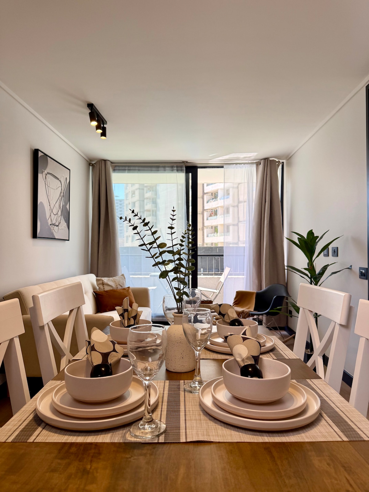 Disfruta de un departamento moderno, luminoso y cuidadosamente decorado. Totalmente equipado para estadías cómodas, cuenta con cama de dos plazas, sofá cama, cocina integrada, Smart TV, WiFi y balcón con vista despejada. Ubicado en zona segura y conectada de Santiago, ideal para descansar o trabajar. Espacio cálido, funcional y pensado en cada detalle para que te sientas como en casa. Excelente ubicación: cercano a Plaza Ñuñoa y Mall Portal Ñuñoa, centros deportivos. Con buena locomoción.
