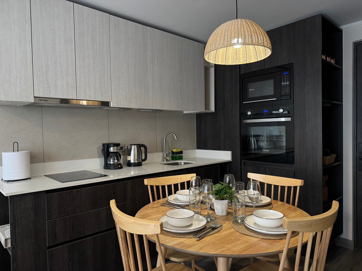 Luminoso, amplio y moderno . Ubicado en zona estratégica de Santiago de Chile, Providencia, una de las comunas con mejor calidad de vida. Polo de actividad comercial, con muchos atractivos históricos y patrimoniales. Excelente conexión de Transporte. A 3 cuadras del Mall Costanera Center y de la calle El Bosque, lugar de restaurantes, cafés y librerías. Design minimalista, cama King Size, Smart TV , Horno Microonda , Encimera y Horno Electrico, Aire Acondicionado Frio/Calor, amplio Sofa.