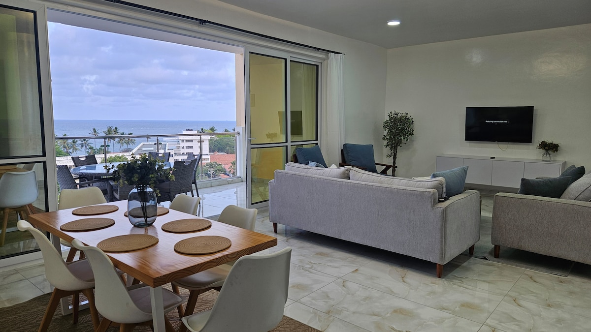 Por qué te va a encantar tu escapada en Seafront: - Último piso, 3 dormitorios con baño en suite - 4 camas; 2 king, 2 queen. - Playa: 3 min a pie - Aire acondicionado (cargo adicional de 25 USD por noche) - Pileta con pileta para bebés - Vistas ininterrumpidas al mar. - Lavadora. - Comedor interior y exterior - Cerca de shoppings, supermercados, restaurantes y un parque acuático - Wifi de fibra óptica rápida - Elevador - Cocina totalmente equipada. - Seguridad y estacionamiento las 24 horas, los 7 días de la semana.