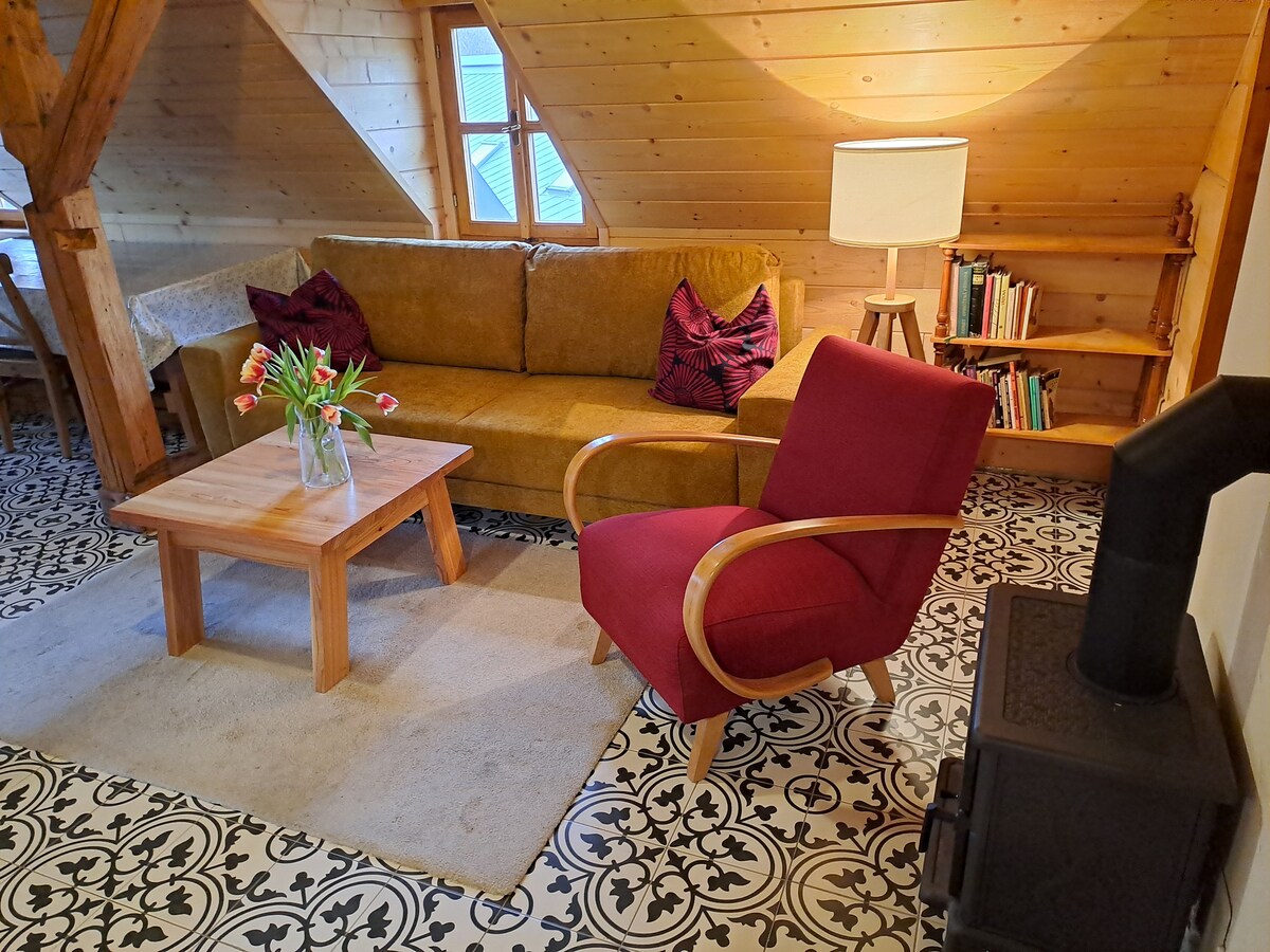 Casa con vistas a las Montañas Búho, ubicada en una zona tranquila junto al bosque. Ideal para parejas, familias y quienes buscan paz y naturaleza. Interior cómodo: dormitorio, salón con sofá cama, cocina, baño, WiFi y TV. Jardín, barbacoa y zona de fuego, además de tumbonas y hamaca en verano. Cerca de rutas y atracciones, incluido el complejo Riese. Apta para alérgicos y muy limpia.