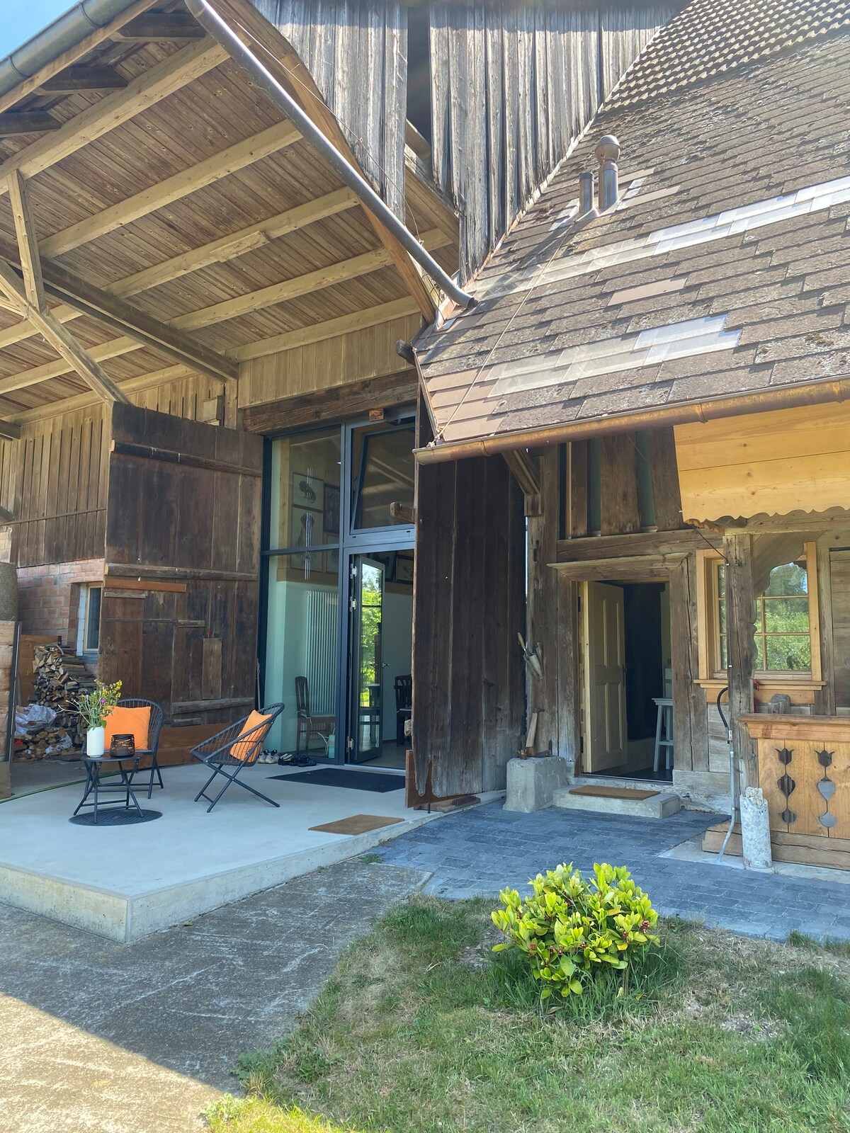 Rural y, sin embargo, no muy lejos de cualquier civilización, se encuentra nuestro pequeño sueño de vida y jardín. La antigua casa de piedra se encuentra en Ersigen, cerca de Burgdorf BE, a veinte minutos en coche de Berna. En el pueblo hay una cafetería, tres restaurantes y una tienda de productos agrícolas. El autobús al centro comercial principal más cercano sale cada 30 minutos durante el día. Ocupamos el segundo piso de la casa y alquilamos dos habitaciones con cocina y baño en el primer piso. ¡Estaremos encantados de resolver cualquier duda que tengas!