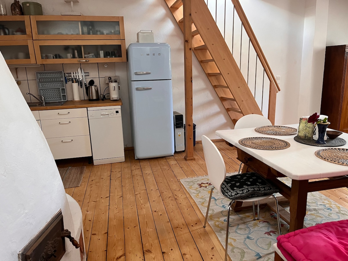 El loft pequeño está en la planta baja de una casa señorial. Es moderno y está cómodamente amueblado: baño elegante en negro y latón, paredes de yeso de cal blanca, piso de hormigón de diseño con calefacción, muchas ventanas, acceso directo al jardín. El espacio inundado de luz, la tranquilidad y el jardín te invitan a relajarte. Las vistas de las colinas y los Alpes te hacen desear hacer senderismo y ciclismo. La estación de tren y la plaza del pueblo con restaurantes y una tienda están a solo unos pasos (4 minutos).
