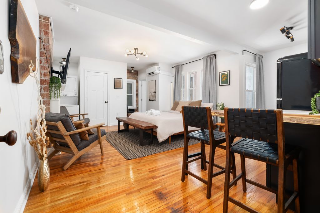 En este estudio en la planta baja en el distrito artístico de Short North, estás a un paso de galerías, bares, lugares para desayunar y el campus de OSU. El interior está limpio y bien iluminado, y cuenta con una cama tamaño king, sábanas frescas y una pequeña isla de cocina donde podés comer, trabajar y preparar algo caliente. Esta configuración y ubicación son ideales para estadías en solitario o un fin de semana íntimo para dos personas: inteligente, cómodo y cerca de todo lo que vale la pena dejar.