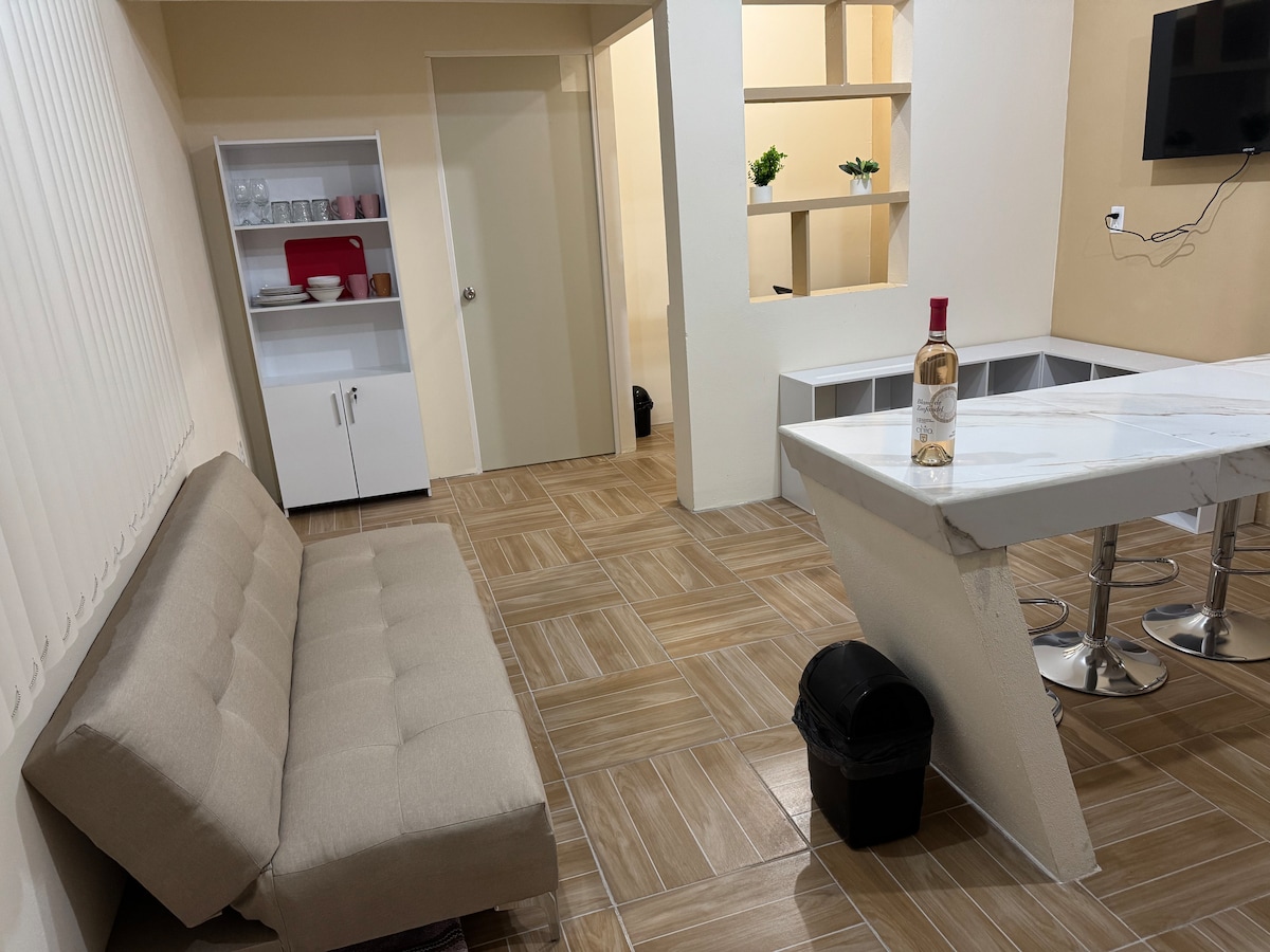 Tendrás todo lo necesario para una estancia larga o corta en la zona. Cama tamaño king en el dormitorio principal con baño completo. El segundo dormitorio tiene una cama tamaño queen y una estación de trabajo tranquila donde podrás realizar tus videollamadas o llamadas telefónicas sin molestias. Agua caliente para duchas calientes, internet de alta velocidad y televisión por cable. 7-11, carnicería, frutería y verdulería y otras paradas rápidas dentro del condominio. Gran centro comercial frente a ti para ir de compras.