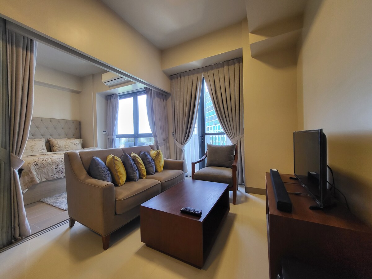 Executive studio for 2 people 15 minutes to Airport Quality Queen Bed Free Drinking Water-Japanese Dispenser Wi-Fi/SmartTV/Free Netflix Lockable Safe Smart Lock access Hot Shower, Bidet Fully Equipped Kitchen Balcony,Seaviews&Breezes Gordon Ramsay/Japan/Korean Restaurants,Concierge,Pool,24hrSecurity Supermarket,7/11,Bakery,Starbucks,McDonald’s,Pharmacy,ATMs 400m walk to Beach, Beach Passes Php350/person daily NOTE:Up to 16 hr daily Construction/Noise is next door. Discounted daily rate is 30%