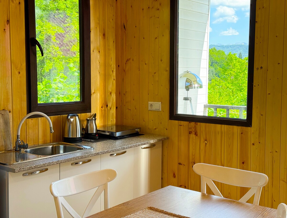 Welcome to our peaceful mountain cottage. Cozy retreat surrounded by forests and mountains. Inside, the cottage is designed for comfort. It features a fully equipped kitchen, a modern bathroom, a bedroom with a queen-size bed, and a living room with a comfortable sofa and a dining table for three. Step outside to enjoy a large garden with a BBQ area and outdoor fireplace, ideal for gatherings under the stars or quiet mornings with coffee or a glass of Georgian wine from the Racha.