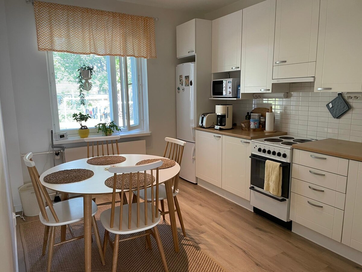 Este acogedor departamento con aire acondicionado de refrigeración y sauna se encuentra cerca de los campus del Hospital Central y de la Universidad de la Universidad. Plaza de estacionamiento. El registro de entrada es sin complicaciones gracias a la caja de llaves. Las camas para dos en el dormitorio están prefabricadas y el sofá cama da una cama adicional para un tercero. Hay café, té, especias y más en los armarios de la cocina que son para nuestros huéspedes. En verano, ¡puedes disfrutar de un café desde tu propia terraza!