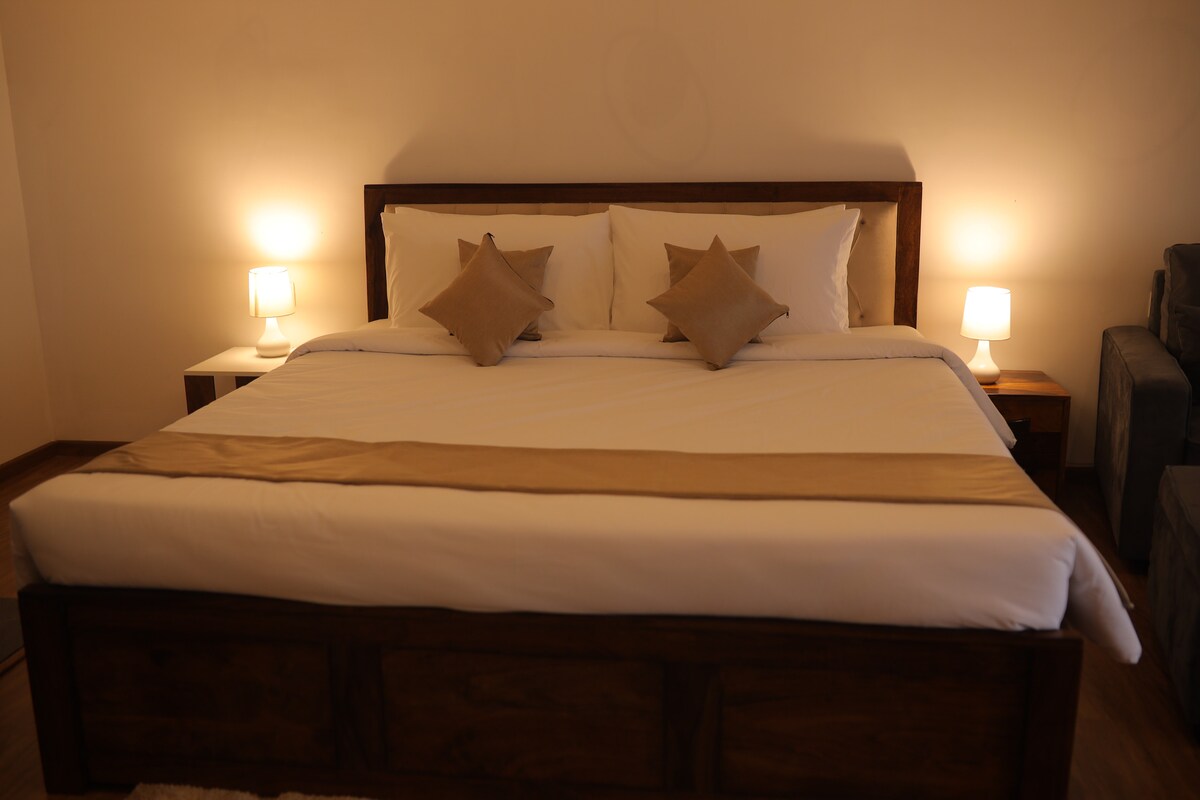 Relax in a stylish room with a king bed, comfy seating, and a serene balcony. Food is not included, but a menu is available with pre-order meal delivery. * Balcony room with valley views * Cozy, spacious interiors * Peaceful nature-friendly location * In-house assistance available * Zomato & Swiggy orders allowed * Meals arranged from outside * Room menu available * Free parking on-site * Ideal for couples & small families