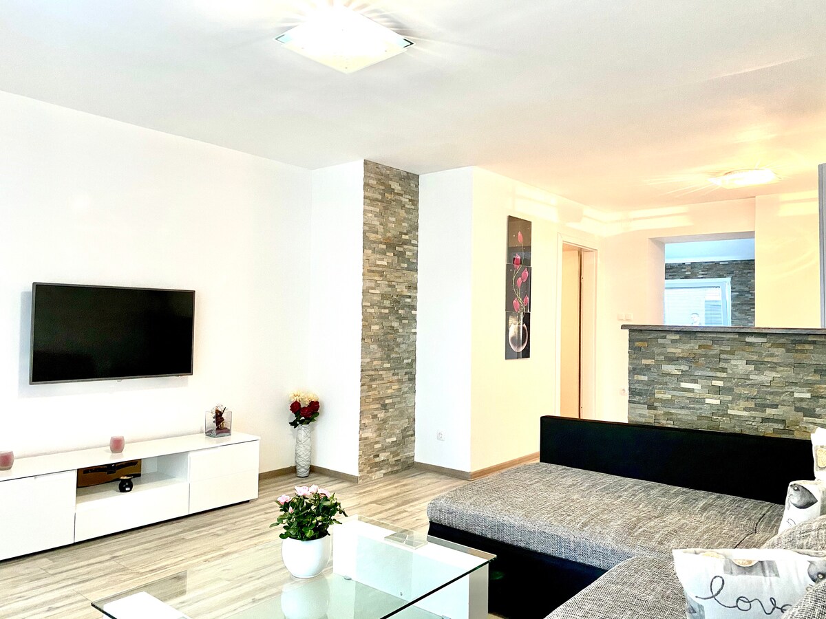 Si anhelas lugares donde buscas paz, naturaleza incontaminada y silencio, ven, porque aquí siempre eres bienvenido. Disfruta de hermosas horas en los días calurosos junto a la piscina privada, por la noche bajo la terraza cubierta junto a la barbacoa. El apartamento tiene aire acondicionado y calefacción central para el invierno. Para los niños tenemos una cama elástica en el jardín y una PS4 en la galería, para ver películas o jugar. En el comedor tienes un televisor inteligente con Netflix.