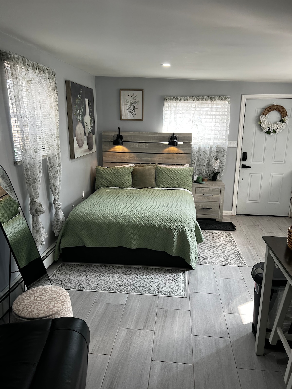 This spacious and serene space has an attached garage. Street parking is allowed until October 15, 2025. You may also park in the attached garage as best you can. Up to you. Set the heat or AC, watch TV, nuke a meal, do some laundry, and there's a small office to gather your thoughts. There's high speed WI-FI and your own private entrance through your garage to come and go as you please.