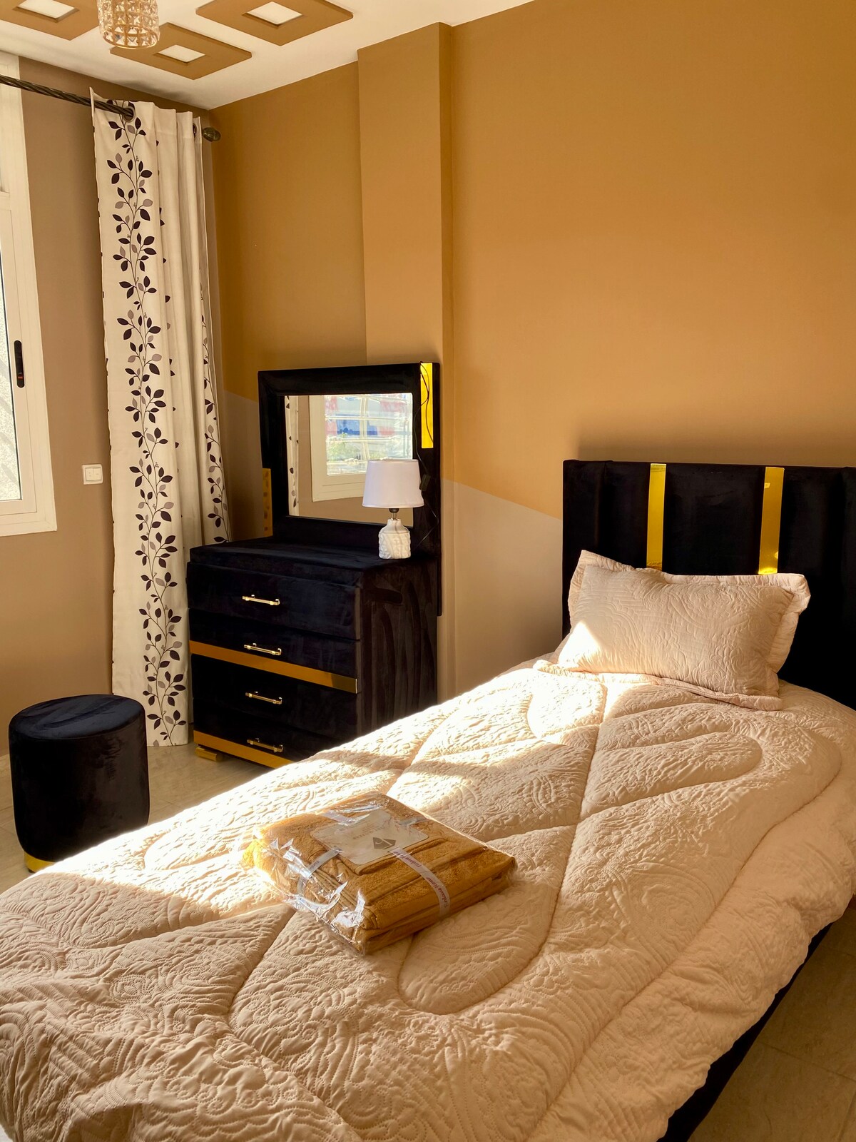 Amusez-vous avec toute la famille dans ce logement chic. notre appartement du luxe ,Situé au quartier el matar à côté de la ( café Dahab,Café Minsa rosita, 10/10. salle sport golden fitnesse. mosquée Mohamed 6...)