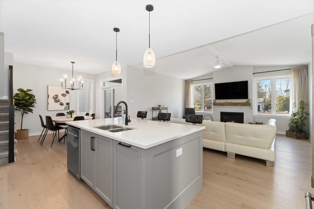 Diviértete con la familia o pasa tiempo de calidad con amigos en esta casa elegante, acogedora y moderna con techo abovedado y chimenea de gas. Ubicada en Richmond, Ontario, esta casa tiene 4 dormitorios, 2,5 baños, TV de pantalla grande y un patio cubierto. A poca distancia a pie de parques, tiendas de comestibles, restaurantes y tiendas. Casa de lujo luminosa y espaciosa con luz natural y aire acondicionado central. Aparcamiento gratuito en el sitio. Pesas, equipo y espacio para yoga. A 25 minutos del aeropuerto, a 30 minutos del centro de la ciudad y a 15 minutos del Canadian Tire Centre.