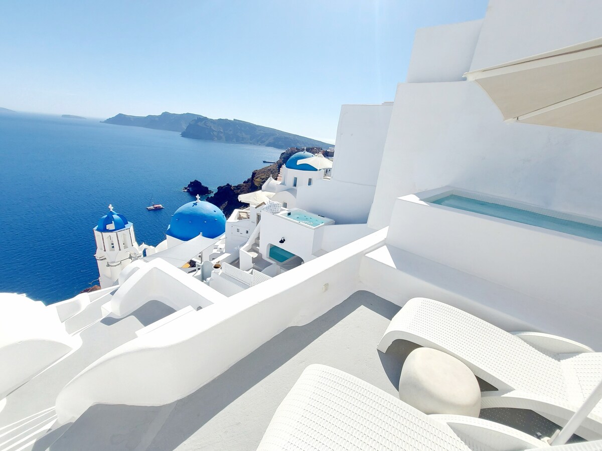 Suite con piscina de inmersión al aire libre y vistas a las cúpulas azules