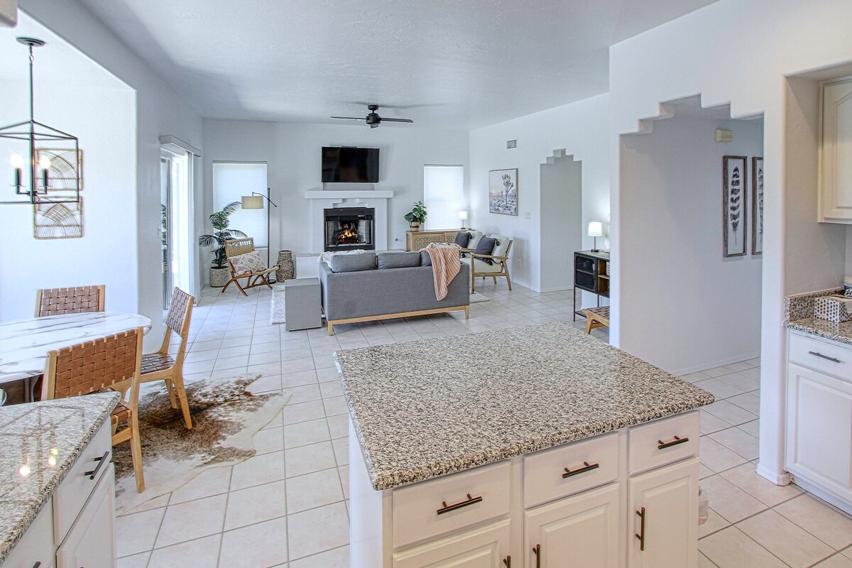 A beautiful 2,362 SF three bedroom, two bath single story house in great condition. Beautiful mountain views from a private backyard and a great Oro Valley location near shopping, restaurants, hiking, golf, walking trails and a state park. This spacious Airbnb comfortably sleeps 6-7 people. The second bedroom has a children’s bunk bed and the third bedroom has a queen bed. The community is a very quiet and friendly neighborhood and is close to all the great attractions in Oro Valley.