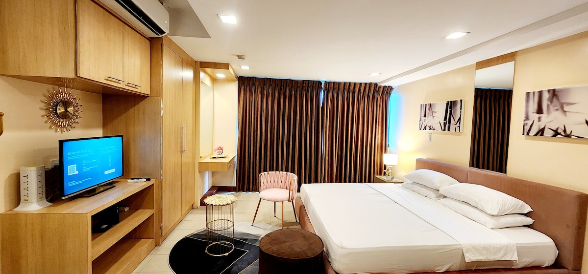 Alójate en mi moderno apartamento tipo hotel en Central Ortigas, a unos pasos de Westin Sonata Place, SM Megamall y Shangri-La Mall. Esta espaciosa unidad de 1 dormitorio ofrece entrada sin llave, persianas opacas, cocina completa, ducha con calefacción, lavadora/secadora y aire acondicionado. Disfruta de servicios de lujo como piscina, gimnasio, sala de juegos y guardería, perfectos para familias y amigos. ¡Consigue todo esto a una fracción de la tarifa de 500 USD/noche de Westin, ofreciéndote comodidad, conveniencia y una excelente relación calidad-precio!