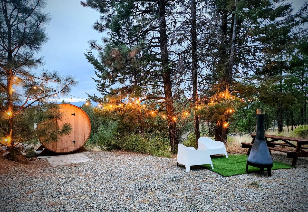 Recharge at this romantic retreat, complete with outdoor sauna. The cabin independently nestles on a forested hillside at the top of Trepenier Bench, overlooking Pincushion and Okanagan Mountain. Unwind and relax with a private, wood-burning sauna, cold plunge tank and outdoor fire pit. The cabin is close to wineries, trails and restaurants, located minutes from downtown Peachland. Big White, Silver Star, Apex and Telemark all within 1.5 hr distance. Let us host your time-out from normal life!