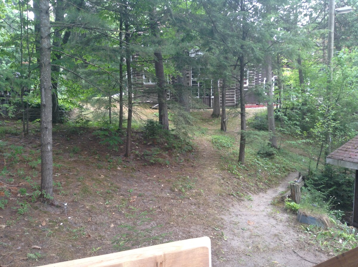 ¡POR FAVOR, LÉELO! Mt. St. Louis y Horseshoe Valley a la vuelta de la esquina! Esta es una SUITE DE INVITADOS luminosa, grande y privada (apartamento en el sótano). Bañera de hidromasaje, patio, chimenea y sendero aislado en el bosque para disfrutar de la naturaleza. La cocina está equipada con una placa de inducción y todas las cosas necesarias, incluso un abridor de botellas de vino :) Sala de estar/cocina/comedor de concepto abierto con TV y Roku. El dormitorio es una obra de arte: ¡oscuro, misterioso y romántico! Cama tamaño queen personalizada hecha de madera de granero desgastada recuperada de nuestra propiedad.