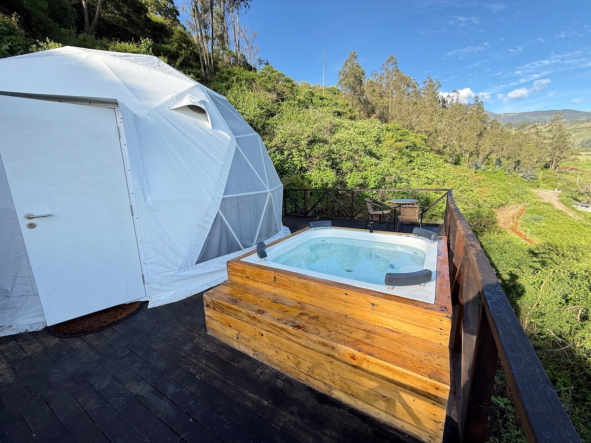 Disfruta una experiencia única en nuestro domo de lujo con cama de 3 plazas, sofá cama, jacuzzi privado y vistas privilegiadas al Cotacachi e Imbabura. Vive Munakuy: cosecha de frutas exclusivas como manzana Ana y arándanos, pesca de trucha y tilapia, mini granja interactiva, desayuno incluido, restaurante de bamboo y un túnel cultural Caranqui para degustación de vinos frutales únicos de Ecuador.