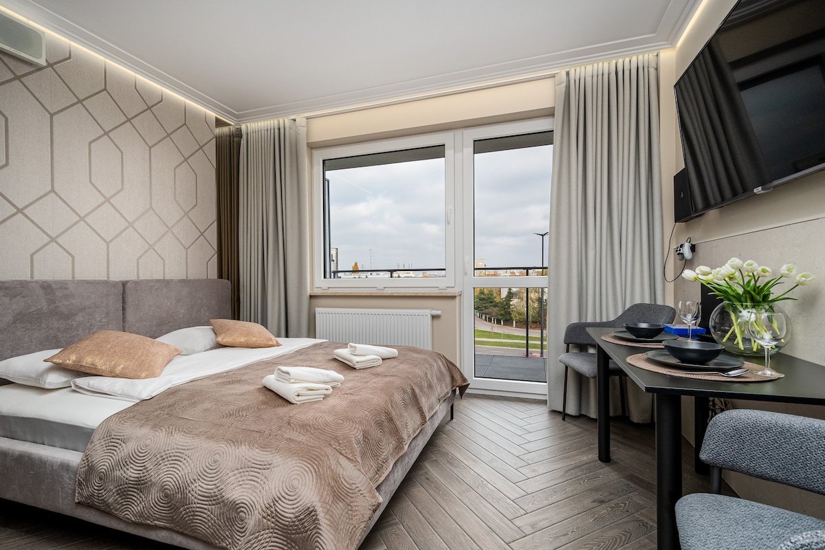 Apartamento cómodo y totalmente equipado en un edificio nuevo. Sala de estar con cocina abierta dividida en comedor y sala de estar. El dormitorio tiene una cama grande y un armario espacioso. También hay un armario como espacio de almacenamiento adicional. En la zona hay tiendas, restaurantes y cafeterías. Equipamiento: aire acondicionado, cafetera, hervidor de agua, plancha, tabla de planchar, lavadora Cómo llegar desde el aeropuerto de Chopin 20 minutos en taxi 50 minutos en transporte público desde el aeropuerto de Modlin 50 minutos en taxi 120 minutos en transporte público