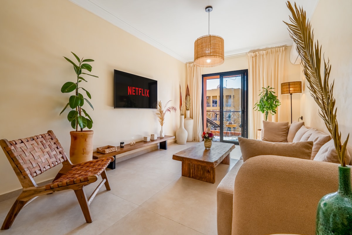 Moderno y cálido apartamento de 72 m² con terraza y piscina idealmente situado en el corazón de Marrakech, en el centro de Guéliz. A 10 minutos a pie del centro comercial Carré Eden y a 15 minutos en taxi del aeropuerto. El magnífico jardín Majorelle y el Museo Yves Saint Laurent se encuentran a 10 minutos a pie. Una piscina en la azotea solo está disponible para los residentes del edificio. Es un apartamento independiente, privado y totalmente equipado con Netflix HD/IPTV y FIBRA ÓPTICA de 100 Mb/s