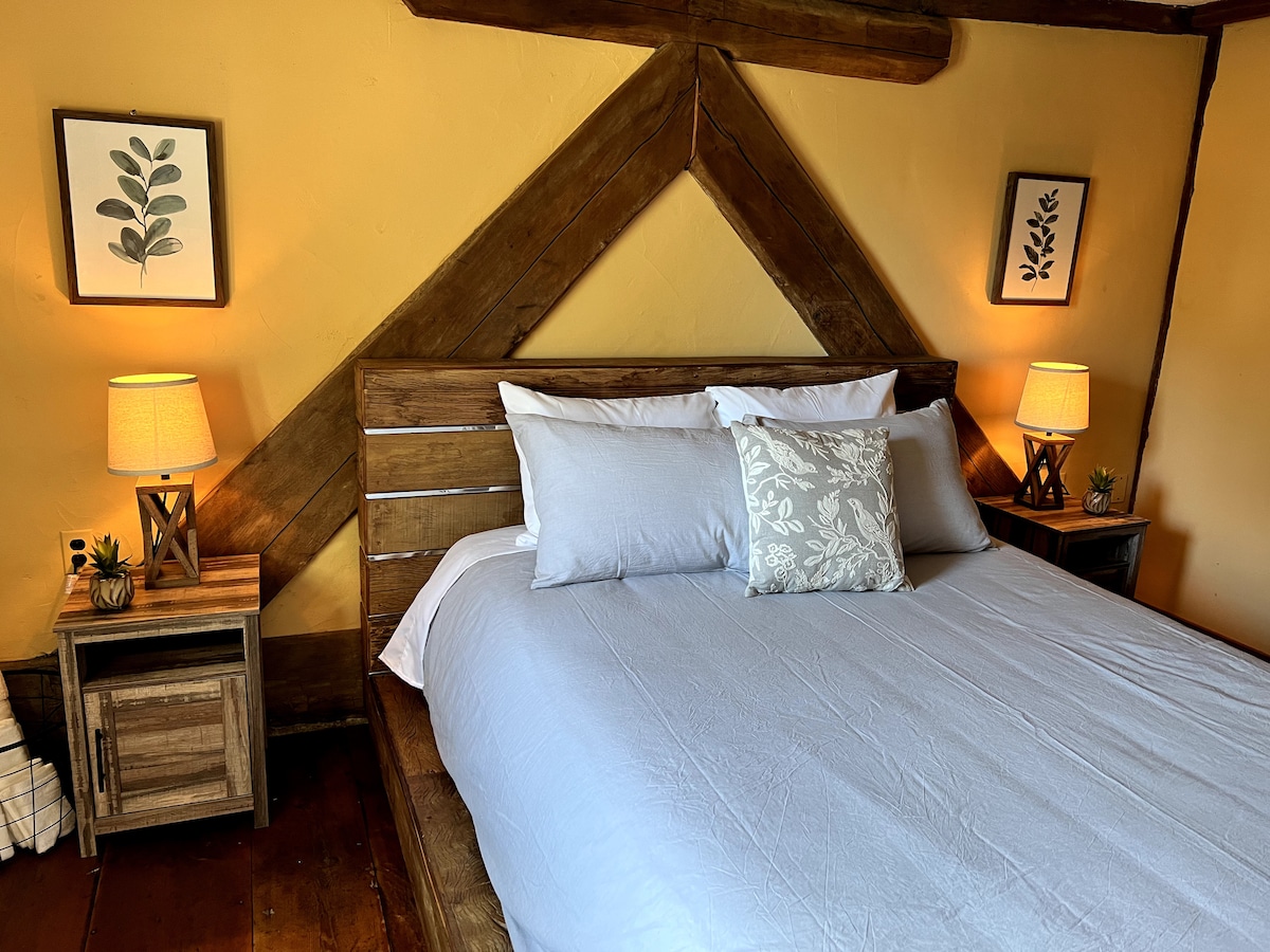 Historic Hope NJ: granero de campo de 2 pisos con capacidad para 1-4 personas; cocina y baño nuevos El loft tiene una cama tamaño king y almacenamiento para ropa. El segundo dormitorio tiene un futón doble. Nueva terraza al aire libre con capacidad para 4 personas; Wifi y acceso a teléfono móvil. Ideal para solteros, parejas, viajeros de negocios, padres visitantes, kayakistas, excursionistas, ciclistas, planeadores, amantes de la naturaleza, etc. Cerca de Delaware Water Gap, Wolf Preserve, mercados de agricultores, antigüedades, Appalachian Trail, Nature Center, Land of Make Believe, Blairstown y Blair Academy: