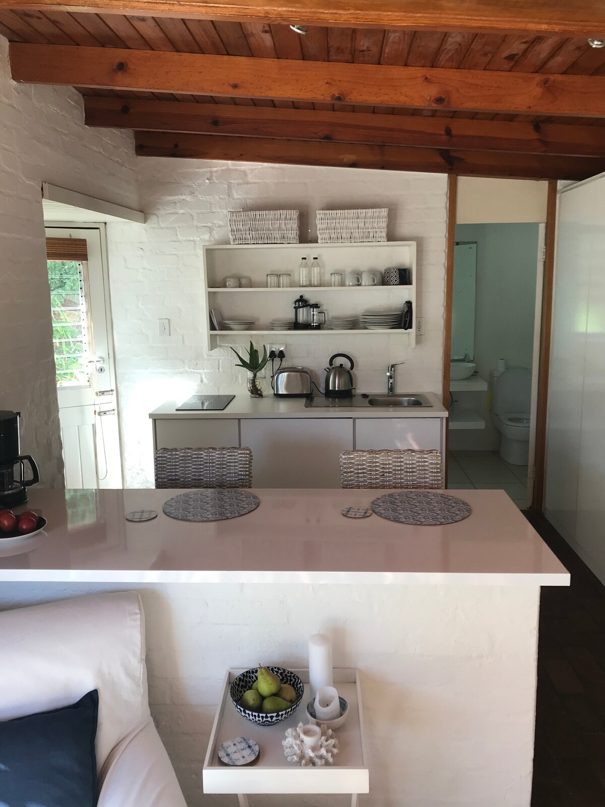 Precioso apartamento tipo estudio tranquilo y independiente en el sereno, exclusivo y seguro barrio de Upper Brandwacht, ubicado en las colinas sobre Stellenbosch, a unos 5 minutos en coche del centro de la ciudad. La casa está enclavada entre viñedos y montañas, y a pocos minutos a pie de un hermoso bosque, una reserva natural y pistas de ciclismo de montaña. Hay una maravillosa sensación de paz en este barrio y las vistas son espectaculares.
