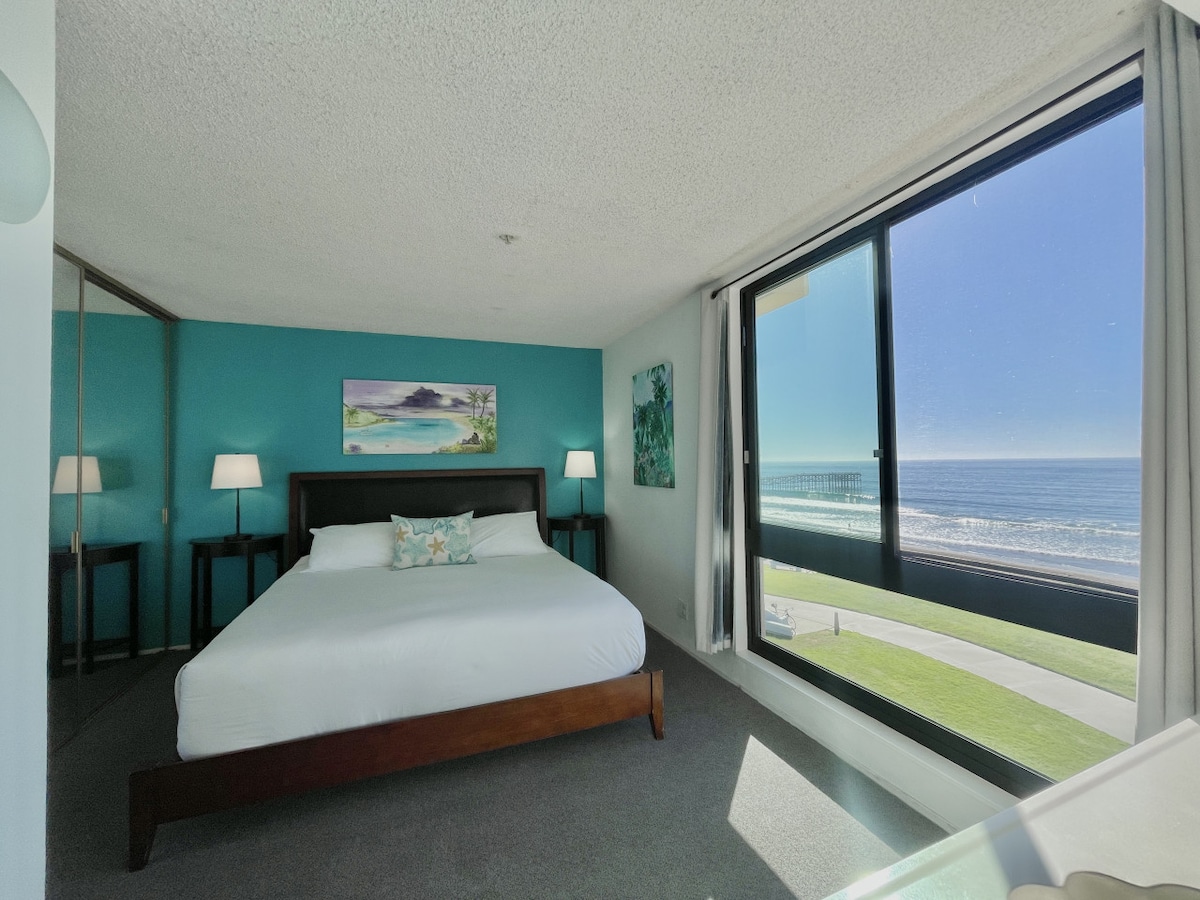 Espectacular frente al mar, octavo piso. Escucha el surf mientras abres la puerta de cristal del suelo al techo. El paseo marítimo y la hermosa playa de natación segura están al pie de tu edificio. Únete a los surfistas utilizando nuestros trajes de neopreno y nuestras bicicletas playeras para un paseo fácil a lo largo del océano y Mission Bay o pasea para observar a la gente vibrante. Regresa a tu elegante y romántico apartamento, equipado para satisfacer todas tus necesidades. ¡Todo lo que necesitas está a 10 manzanas a lo largo de la hermosa costa de California!