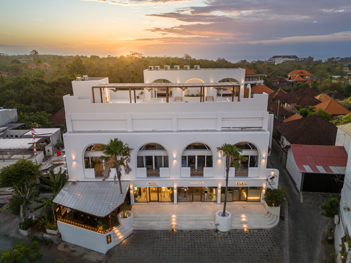 A huge apartment is located in a 6 room boutique hotel on a Bingin hills. We have a unique architecture and design alongside with prime location and the view. We offer you a city comfort in a jungle. Here are some features that we have: - 60m2 total size - ocean view rooftop - fireplace and BBQ - 60m2 rooms with balconies - 4-5 min drive to 4 beaches - yoga mats, dumbbells and resistant bands - speaker in each room Your studio is equipped with everything you need to cook and stay long term.