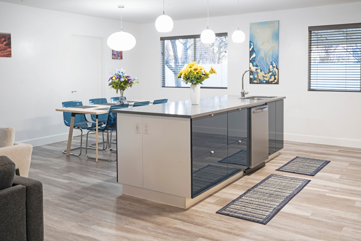 Disfruta de impresionantes vistas todo el día desde este espacio amplio, abierto y moderno. Con techos de 20 pies y ventanas de pared a pared, disfruta de la belleza natural de la zona desde la comodidad de tu hogar. 3 dormitorios grandes y 2 baños divididos en 2 plantas con 2 camas adicionales. Horseshoe Bend está a 5 minutos y Antelope Canyon y Lake Powell están a 10 minutos. Barbacoa, cena o contempla las estrellas desde el patio trasero y la terraza superior, siéntate alrededor de la hoguera, disfruta de un juego de tejo, futbolín, dardos o baloncesto de arcade, 5 televisores, wifi rápido, lavandería.