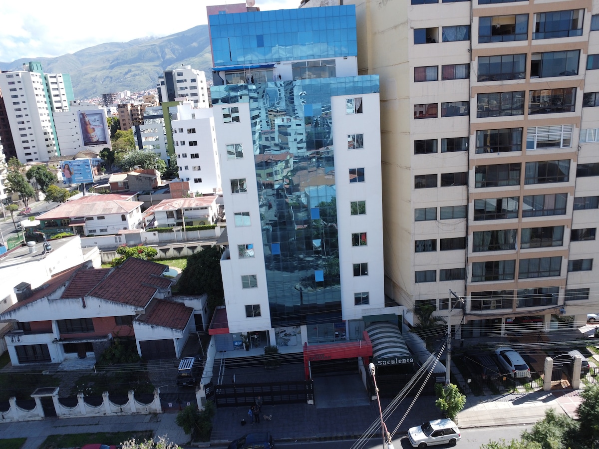 [español, english, français] Luminoso y confortable monoambiente nuevo, en la mejor zona de Cochabamba cerca de centros comerciales, restaurantes, parques, entidades financieras, mercados, supermercados, bares. Areas comunes incluyen piscina infinita (atemperada los fines de semana y feriados), churrasquero, lavadoras gratuitas, TV Netflix. Estaremos encantados de recibirles y hacerles pasar una estadia placentera.