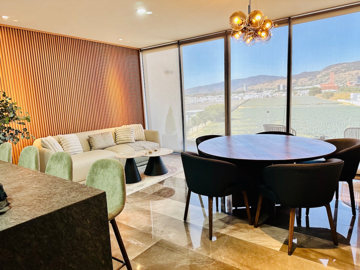 Lujoso departamento con acabados premium y un proyecto de interiorismo cuidadosamente pensado en cada detalle para lograr una experiencia diferente y única, súper acogedor con ropa de cama y colchones premium para que tu descanso sea lo mas agradable posible, cuenta con una gran vista al Bosque de la Primavera y Punto Sur Lifestyle Center. A tan solo 100m de Punto Sur Lifestyle Center: tiendas de ropa, cine, casino, bares, restaurantes CUALQUIER VISITA DEBE ESTAR INCLUIDA EN LA RESERVACIÓN