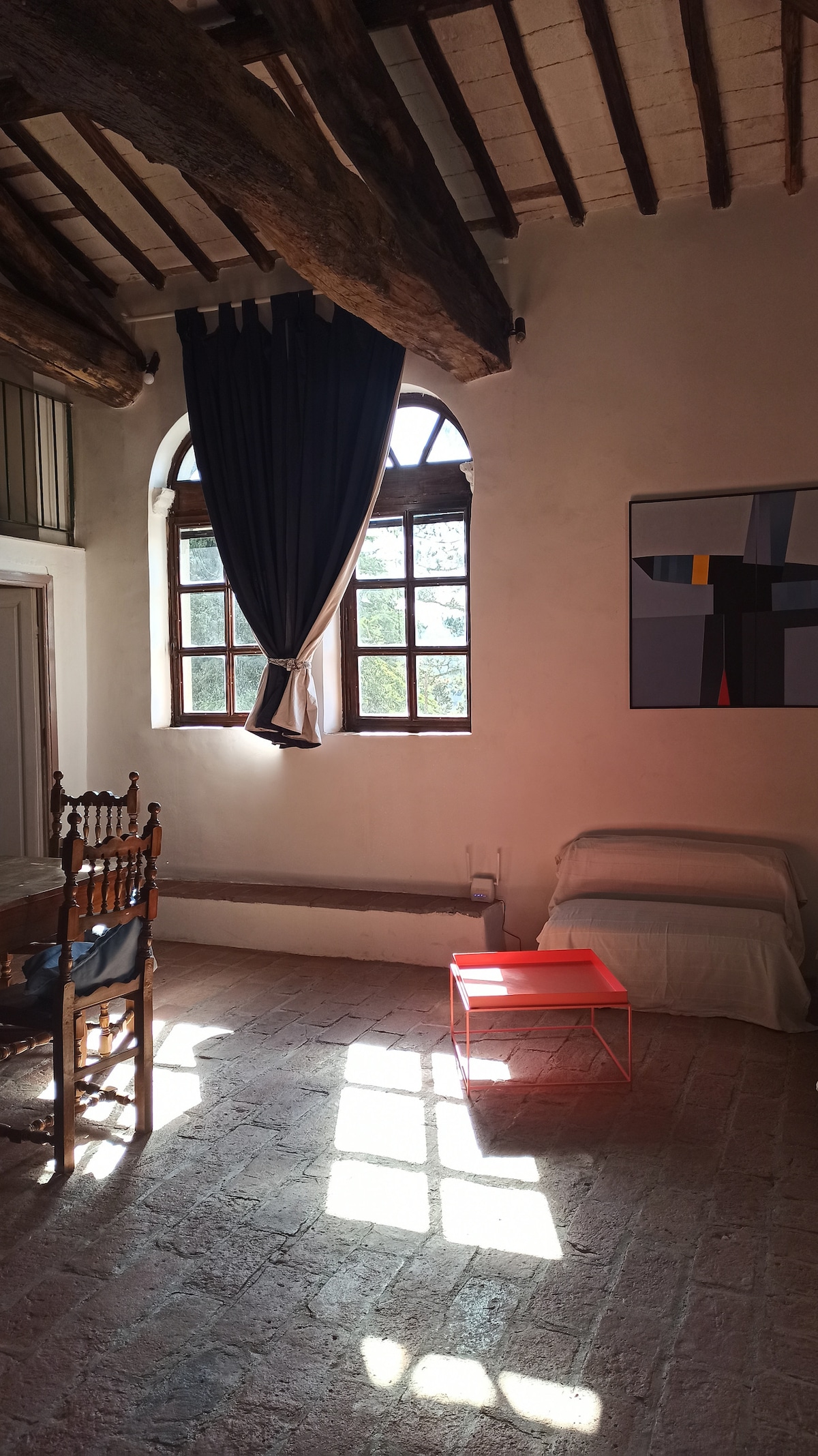 El apartamento Abbacio forma parte de una antigua granja que ha sido restaurada respetando la estructura y el estilo originales. Su ubicación está justo en la cima de la colina, frente al valle. Rodeado de viñedos y olivos, pero también unido al pueblo. Desde la casa se puede llegar fácilmente a pie a bodegas, granjas y restaurantes. Panzano está a medio camino entre Florencia y Siena, a la que se llega fácilmente en coche. En autobús hay un buen servicio desde y hacia Florencia, no desde y hacia Siena. ¡Un lugar muy tranquilo!