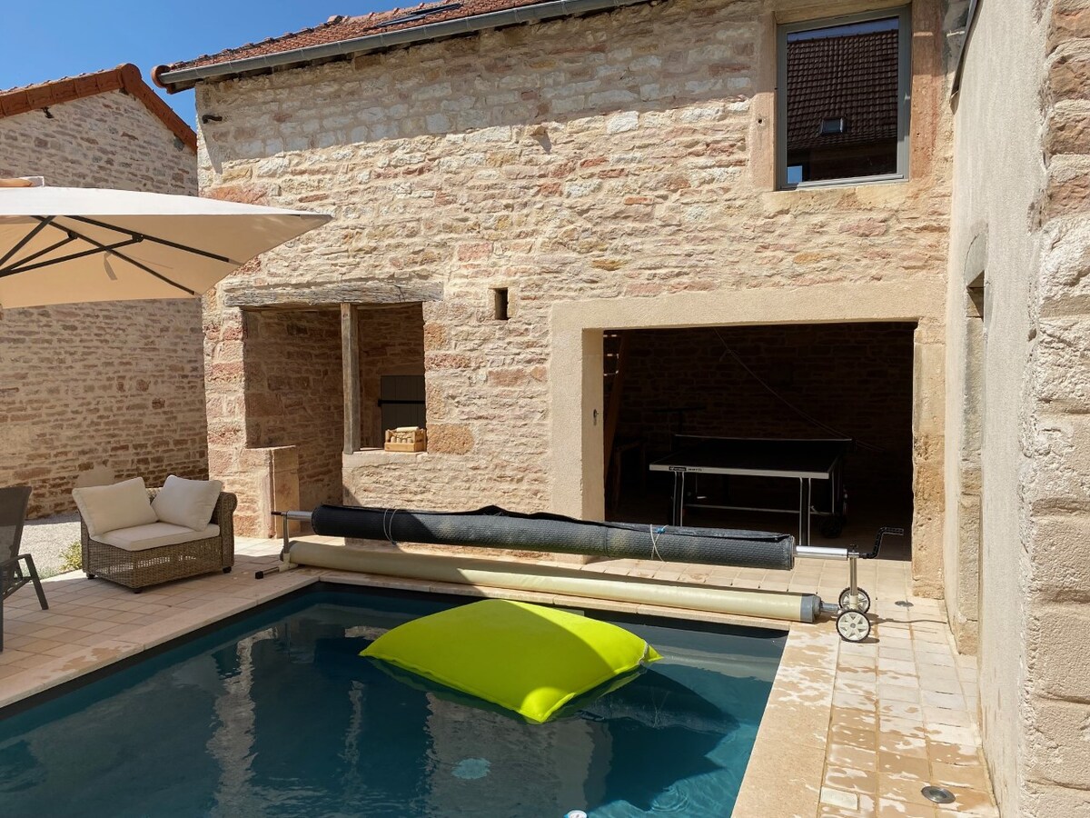 Casa vinícola, reformada en 2021, en el centro del pueblo vinícola de Givry, situada en la ruta del vino de la Côte Chalonnaise. Casa rural de 80 m2 con patio interior compartido donde se pone a su disposición muebles de jardín, acceso a la barbacoa, mesa de ping-pong, así como a la piscina climatizada (de mayo a octubre dependiendo del clima) Capacidad para 4 personas. Cocina equipada, sala de estar con TV y 2 dormitorios, 1 de ellos con baño. Todos los servicios y actividades (bicicleta, degustación, ...) cerca