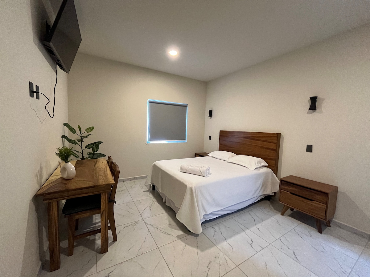 Departamento tipo Loft pequeño con todo lo necesario para una estancia placentera -Cocina Privada con Parrilla, Refri, Micro, Utensilios; ahorra y haz tu super -Baño Privado pequeño y espacioso -Escritorio Amplio y Wifi Veloz, trabaja desde aquí -Cama Matrimonial, descansa y ve la Smart Tv en un colchón confortable -Espacio Suficiente, guarda ropa doblada o colgada -Ventanas Amplias, gran iluminación y ventilación Gran Ubicación para Turismo, Viaje de Trabajo, Estudiantes o Salida en pareja