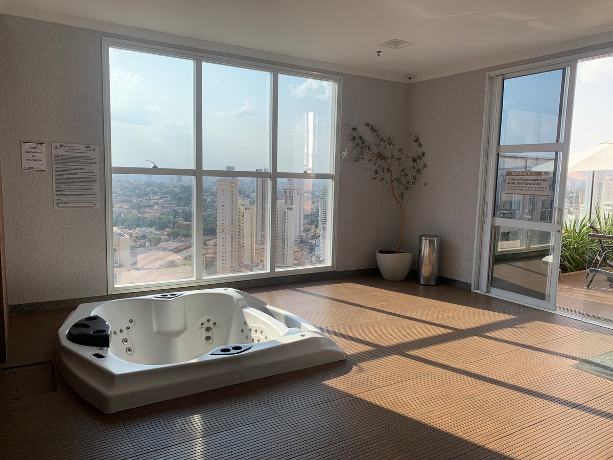 ¡Apartamento único y acogedor! Con 1 dormitorio, 1 cama queen, totalmente amueblado, excelente ubicación, con Wi-Fi, 2 televisores inteligentes, electrodomésticos como microondas, cafetera, filtro con agua fría, plancha, secador de pelo, ropa de cama y baño y garaje privado. Área de ocio completa con piscina climatizada, sauna, jacuzzi, gimnasio, lavandería, y en el centro comercial hay excelentes restaurantes y cafeterías. Junto al mejor centro comercial de Goiás, Flamboyant Shopping.