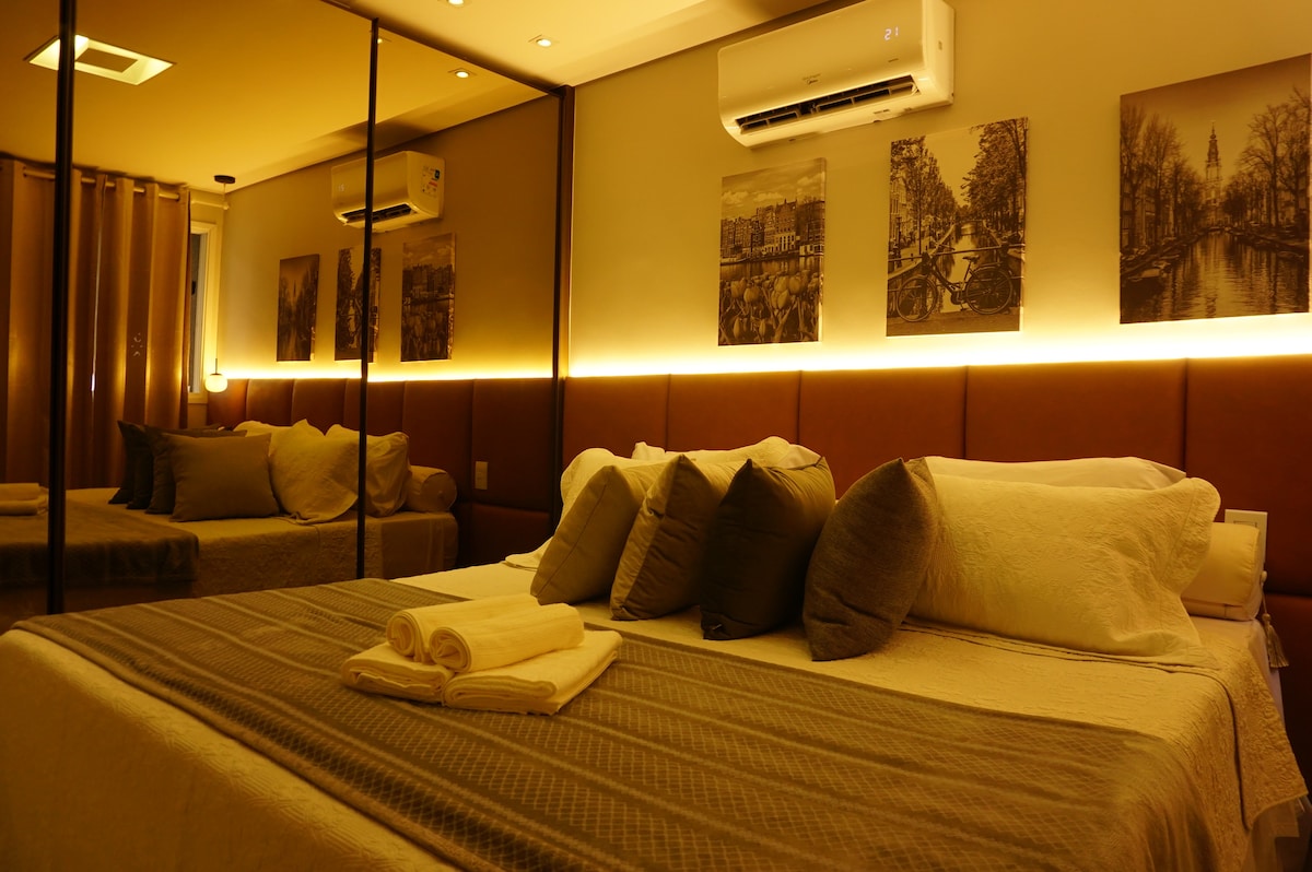 Loft de alta gama. Hospitalidad estadounidense Cama queen, colchón de látex y muelles ensacados. Cocina completa para cocinar con varios electrodomésticos. Tiene aire acondicionado Ideal para trabajar: escritorio, silla ergonómica, wifi de alta velocidad (400 Mb). Se proporcionan toallas y sábanas. Es necesario enviar el documento de identificación de los huéspedes, que solo pueden ingresar al condominio con los datos de este documento.