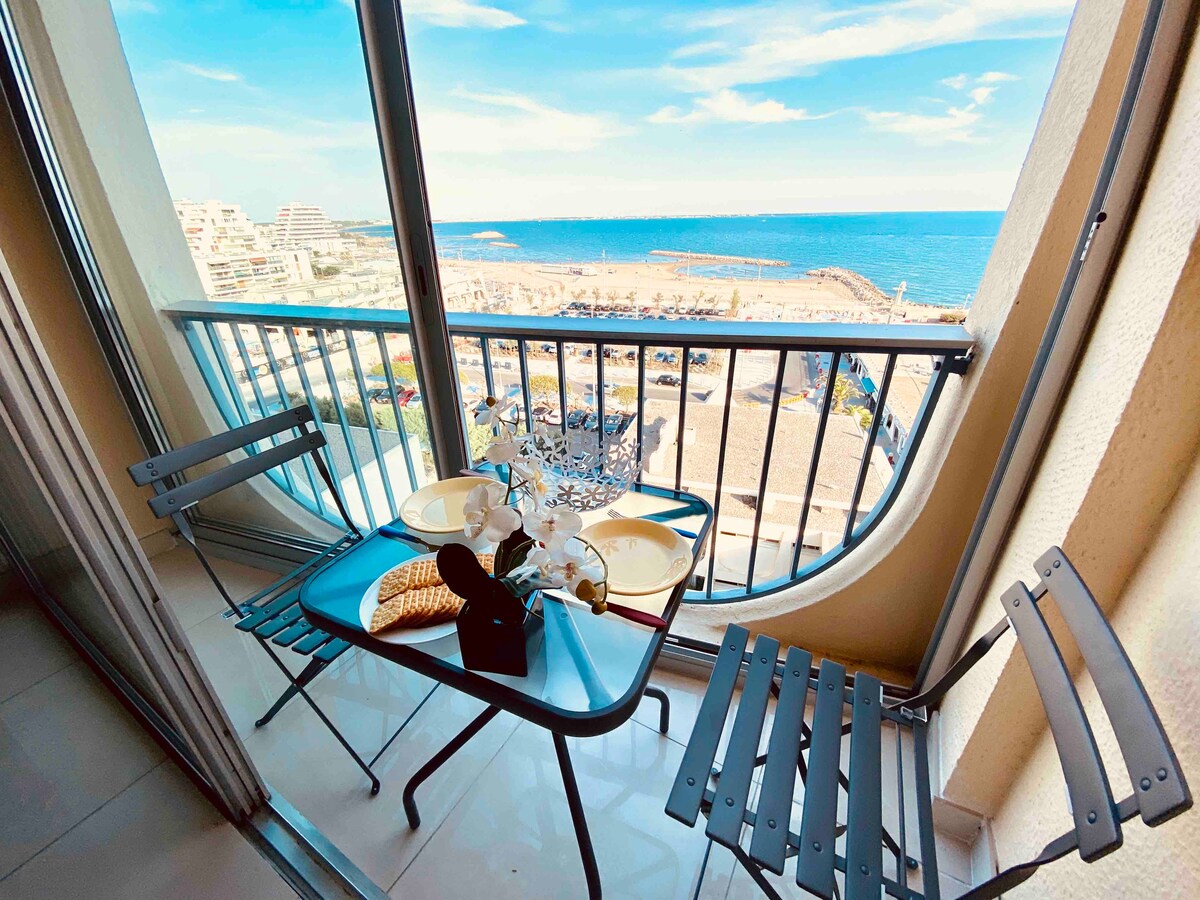 Studio cosy, Label Classé 3* par #étoiles de France# en 2ème étage bien équipé.Vue dégagée sur Jardin, port et mer. Très calme, repos assuré. Jolie résidence sécurisée avec gardien Ascenseur Parking privé NUMEROTÉ Tout accessible à pied, à quelques minutes, plage à 8 mn. A deux pas du port, casino. Accès flexible au logement en toute autonomie et discrétion par boîte à clés. Aeroport Montpellier situé à 15 minutes.