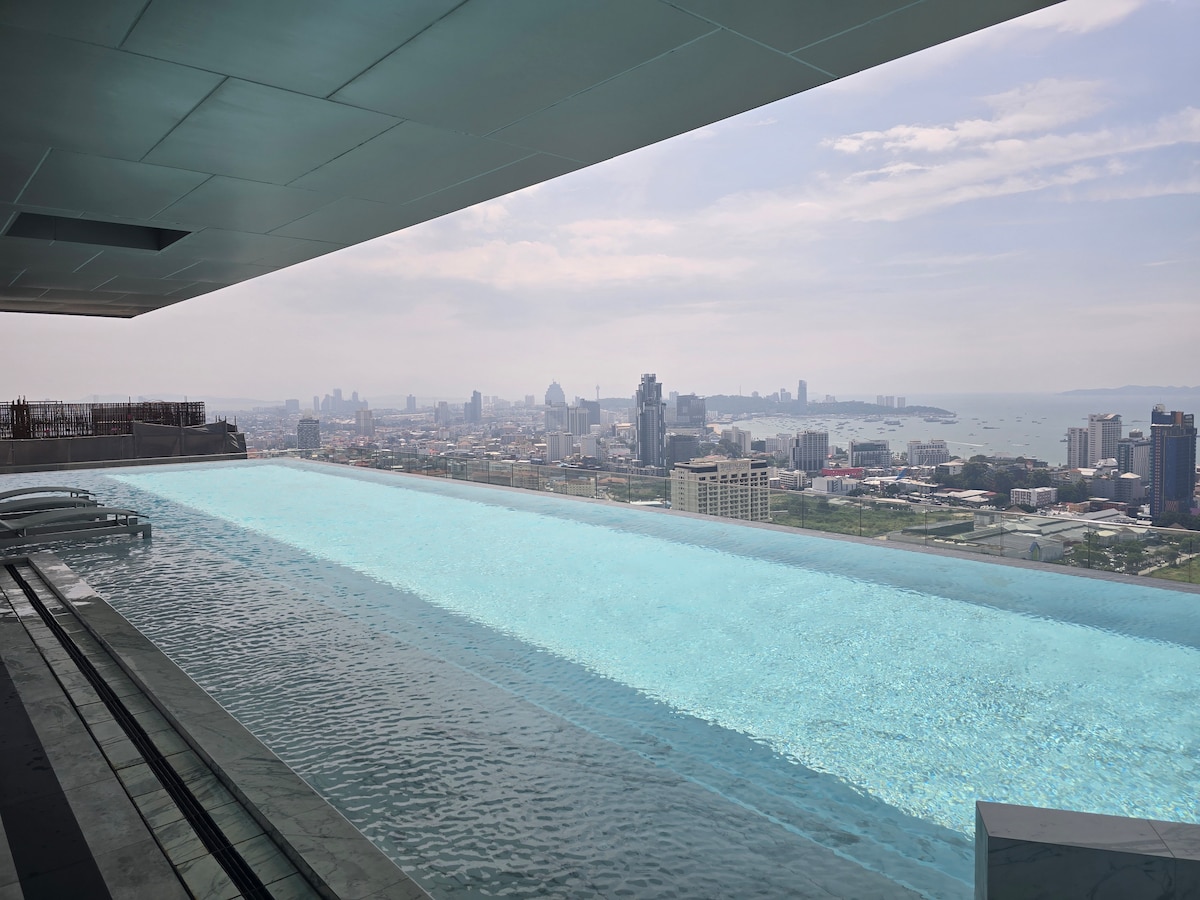 Relax in a stylish high-floor 1BR with a clear sea view from the balcony—perfect for enjoying coffee any time of day. The room is beautifully decorated and fully equipped with Smart TV, full kitchen, fresh linens, toiletries, and a washing machine. The building offers a rooftop pool (same floor as the unit), gym, and 24/7 security. Amazing location next to Central Festival, the beach, and Walking Street. Fast communication and warm hosting guaranteed.