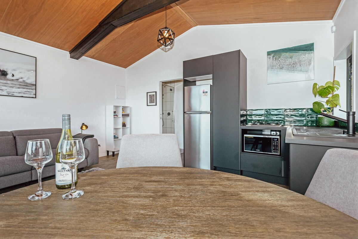 Una vaina elegante y cómoda configurada para brindarte la máxima privacidad mientras disfrutas de nuestra excelente ubicación. Al otro lado de la calle se encuentra la playa de Waikanae y el siempre popular Capitán Morgans. A poca distancia a pie se encuentra el centro de la ciudad o siga el hermoso paseo marítimo hasta algunos de nuestros mejores restaurantes.