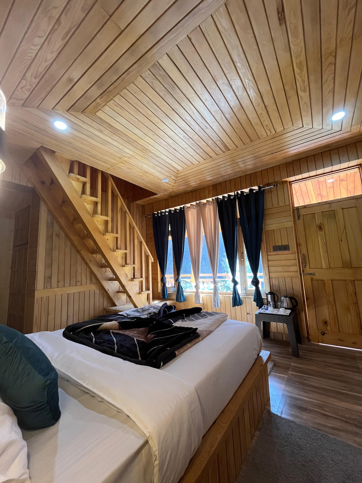 🏡 Embrace mountain tranquility at Rubaroo - a place where you'll love to be ❤️ Unwind in our spacious wooden cottage featuring a plush king-size bed and a unique L-shaped balcony with dual entry points. Located on the first floor of our mountain villa, your room offers the sunrise views alongside distant peaks. Experience the perfect blend of rustic charm and comfort. Enjoy home-cooked meals, starlit nights ✨, and genuine mountain hospitality in our serene village near Jibhi 🌄